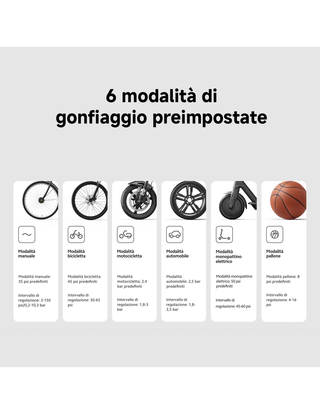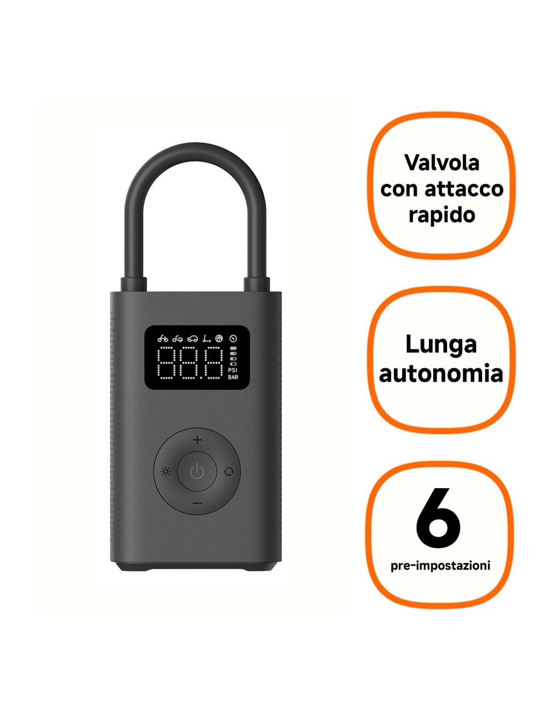 Xiaomi Portable Electric Air Compressor 2. Massima pressione operativa: 10,3 bar, Emissione acustica: 80 dB. Colore del prodotto: Nero, Adatto per: Universale. Alimentazione: Batteria. Larghezza: 45,8 mm, Profondità: 75,5 mm, Altezza: 123 mm